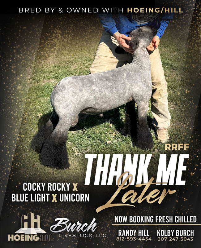 This Shower Chicken son always gives you that cocky "look at me" attitude. He runs uphill and has a cool turn to his rib, while possessing a monster rack and a superb wide square loin edge. Thunderbird's leg wool and bone are off the charts.